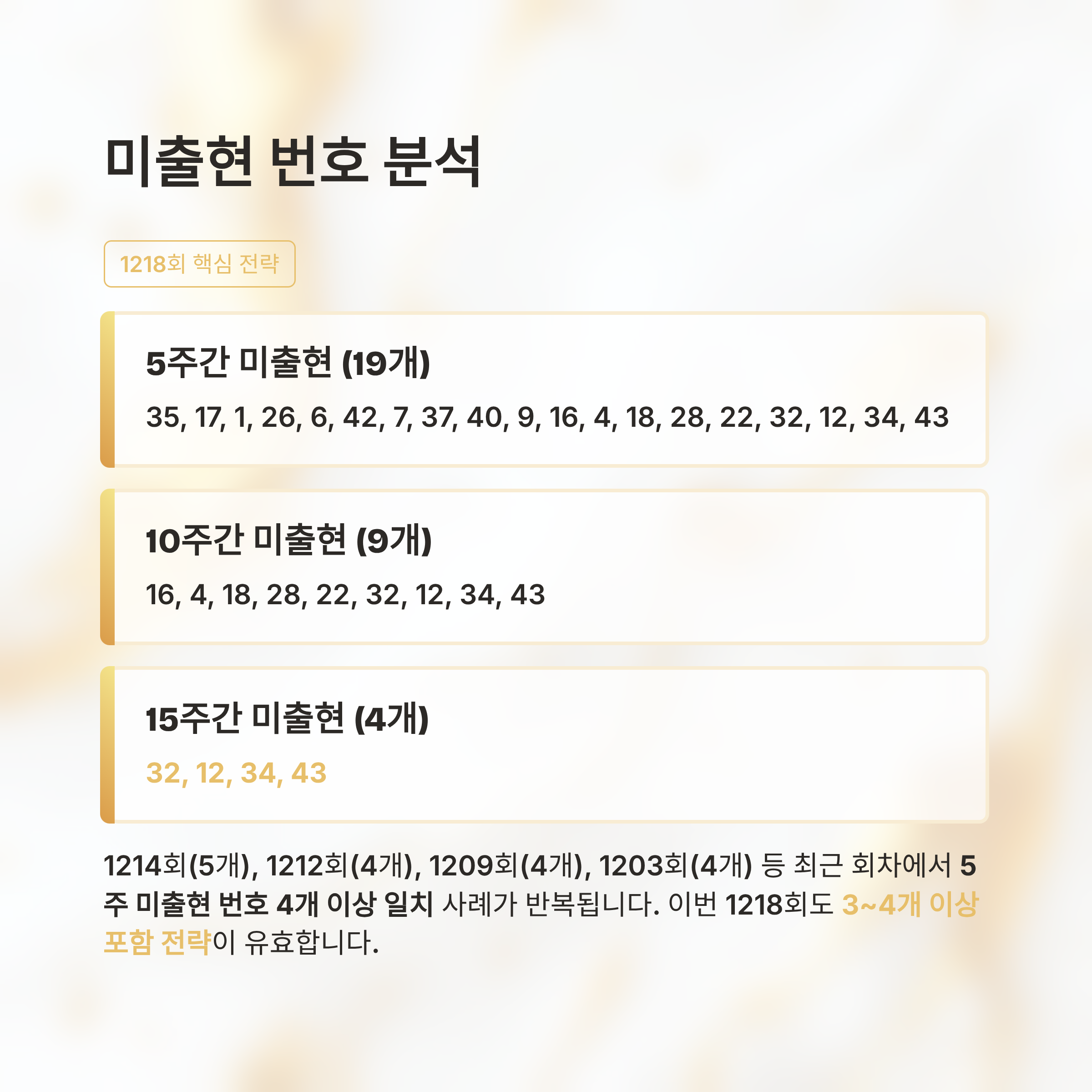 따라서 이번 1218회 예상번호를 선택할 때는 5주간 미출현 번호에서 3~4개 이상 포함시키는 전략이 설득력이 있습니다.