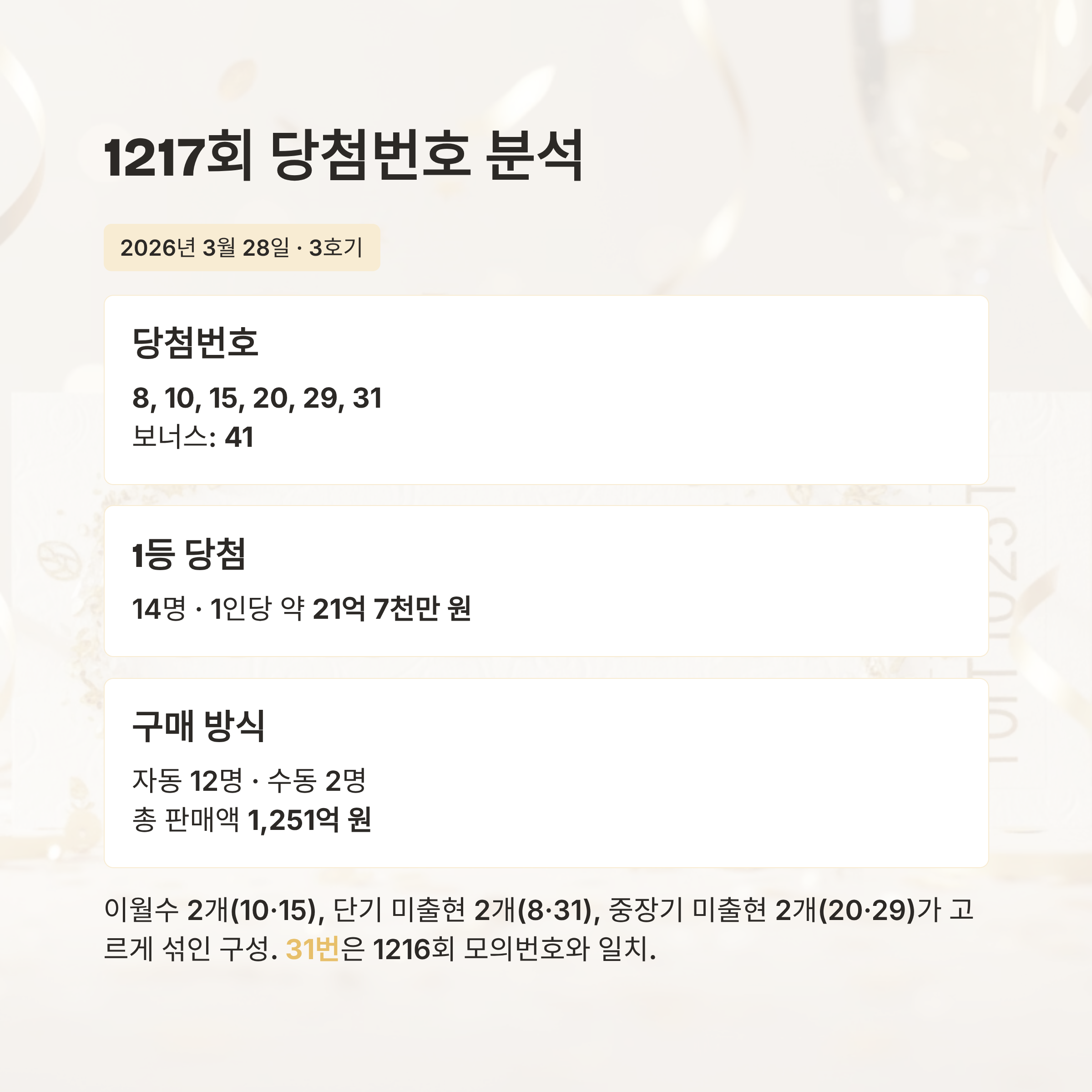 이처럼 1217회는 이월수 2개(10번, 15번), 단기 미출현 번호 2개(8번, 31번), 중장기 미출현 번호 2개(20번, 29번)가 고르게 섞인 구성이었습니다.