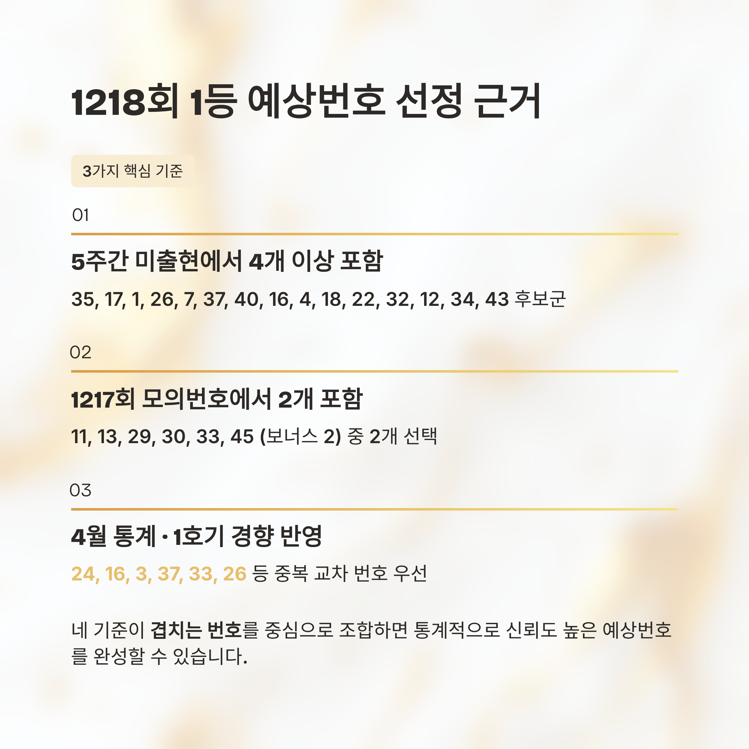 첫째, 5주간 미출현 번호에서 4개 이상 포함, 둘째, 1217회 모의번호에서 2개 포함, 셋째, 4월 통계 및 1호기 출현 경향 반영입니다.