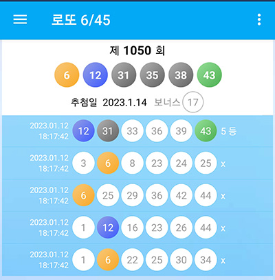 지난주 로또 1050회 예상번호를 무료 추천 받았던 로또645앱에서 5등 당첨도 한개 나왔습니다.
